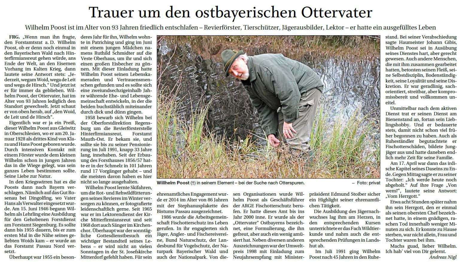 Die Kreisgruppe Freyung-Grafenau des BUND NATURSCHUTZ ist traurig über den Tod von Herrn Wilhelm Poost, der im April 2021 mit 93 Jahren in Hinterfirmiansreut gestorben ist.